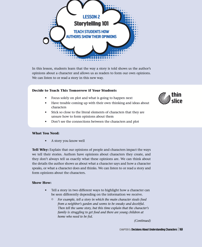Authors of fiction develop storylines that guide readers to connect character action and behavior to their emotions. This helps children see that characters tin can have a wide range of emotions shared throughout a story. Storylines finer help people relate to ane another. The cool office most lesson two is that students begin to clarify why an author is telling a story in a certain style. Students will exist taught to consider what the author'due south stance about the character might be based on how the story is told. This is high-level thinking at its best.